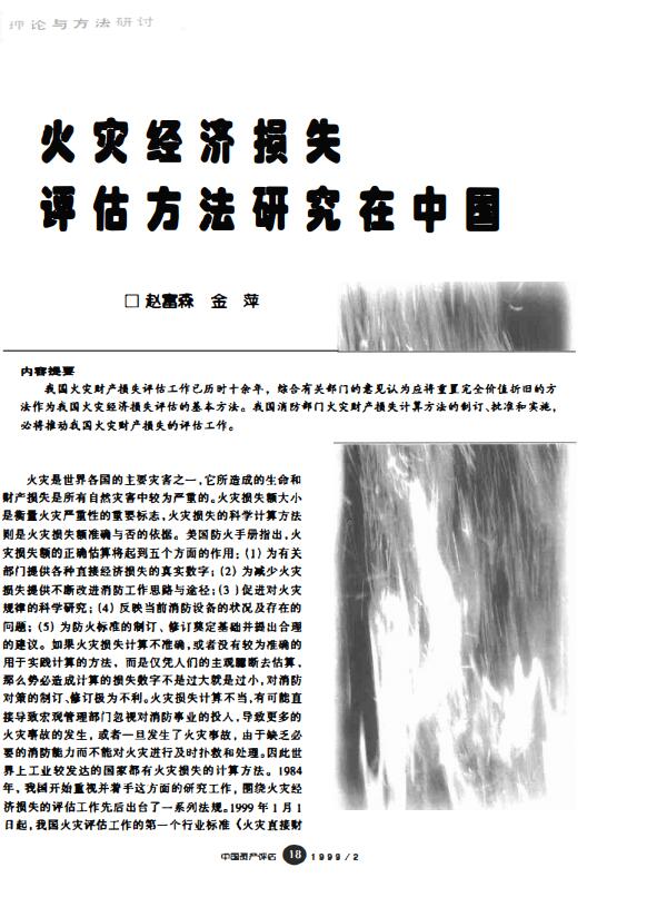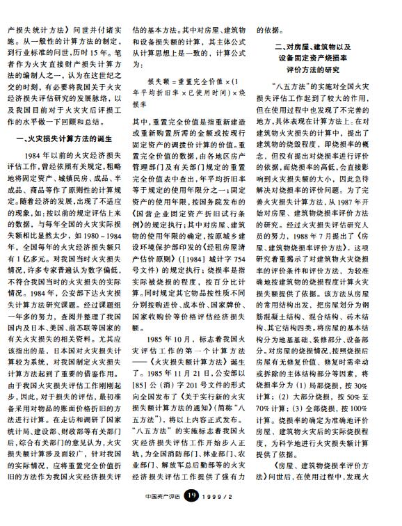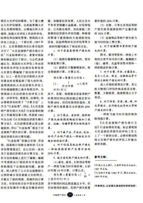 导读:我国火灾财产损失评估,财产价格评估工作已历时十余年,综合有财产损失评估公司的意见认为应扦重置完全价值折旧的方法作为我国火灾经济损失评估的基本方法。我国消防料门火灾财产损失计算方法的制订、批准和实施,必将推动我国火灾财产损失的评估工作。(火灾直接财产损失统计方法〉行业标准的实施,标志着我国火灾直接经济损失的评估工作又上了一个新的台阶,必将对推动我国火灾财产损失评估,资产评估工作做出新的贡献。