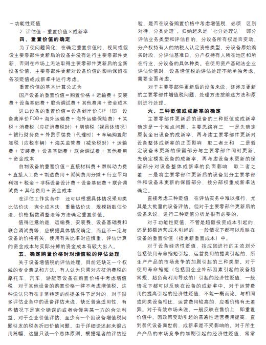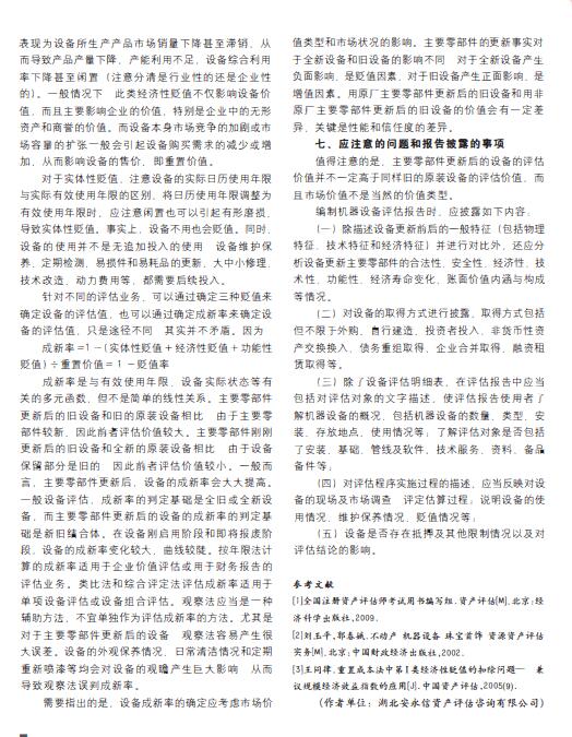 导读:机器设备评估公司对机器设备评估主要零部件更新后的设备评估是评估实践中的一个难点。本文系统地介绍了主要零部件更新后的设备的设备评估特点和评估分析内容,整体资产评估公司并对评估方法适用性和评估思路、重置价值的确定、增值税的评估处理、三种贬值或成新率的确定、评估公司应注意的问题和报告披露事项进行了全面论述。如果说设备(指广义上的)评估的历史就是资产评估的历史的确一点都不夸张。因为资产评估就是从开办合资企业和国企改制评估开始起步的。过去主要采用资产基础法(成本法)评估企业价值,而设备又是企业的常规资产。虽然我们已拥有二十多年的设备评估实践经验,但并不能说明设备评估不存在问题。由千技术进步新型设备的产生、税收制度环保要求和能源政策等因素出现设备评估技术需要与之相适应。本文将结合评估实务对主要零部件更新后的设备评估问题进行探讨。