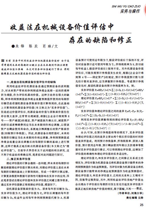 导读:目前实务中利用收益法机器设备评估时由于设备评估公司没有考虑到未来的每期折旧额应当在未来期间作相应固定资产评估公司调整造成评估值不准确本文对实务评估值进行了修正得到能够真正反映机器设备价值的理论评估值。当评估对象为机器设备且将机器设备预计能带来的净现金流预测值作为收益预测值时,理论评估值P2和实务评估值P1之间的关系和上文稍有不同,但表外资产评估推导过程类似,另外,机器设备评估利用收益法评估房地产价值也会出现由千评估前后每期折旧发生变化引起实务评估值不能真正地反映房地产价值的情况,限于篇幅,不再一一赘述。 |