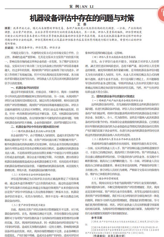 导读:改革开放之后,资产评估,资产评估公司随之而来频繁的市场交易、各种产权制度以及经济结构的优化调整。一方面,产业结构的调整、企业资产的设备评估重组、企业合并机器设备评估等对评估行业的需求越来越大。另一方面,评估人员素养的偏低、评估管理制度不健全以及评估实务本身的工作特点等导致机器设备的评估实务中存在问题。设备评估公司就机器设备评估过程中的部分问题如固定资产评估公司评估方法的选择、评估范围的确定以及最后评估报告内容真实性等问题进行探讨与解决,希望对以后的评估有所帮助。