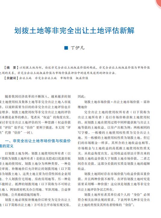 导读:上海评估公司,评估机构以划拨土地为例,论述非完全出让土地权益价值的构成,非完全出让土地权益土地评估价值与房地产评估市场价值之间的关系,土地评估公司非完全出让土地权益价值与市场价值在评估中的适用及适用的评估方法。随着我国经济改革的不断深入,越来越多的划拨土地使用权及集体土地等非完全出让土地入市流转,以流转需要为目的的非完全出让土地评估也日益增多。划拨土地使用权等非完全出让土地的评估历来都是业界的难点。笔者从“权益”的角度出发,探讨非完全出让土地评估的另一种思路(权益价值用“评估”似乎比“估价”更利于描述,本文用“评估”代替“估价”一词)。   |
