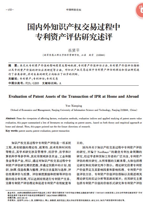 导读:本文从专利价值评估,版权评估的影响因素及影响价值评估机理、专利权评估,软件著作权评估方法、专利资产价值评估指标以及专利资产价值的评估,技术评估应用研究等方面,对知识产权交易过程中专利资产评估的理论和实证研究进行了分类分析,并对未来的研究方向给出了初步的判断。