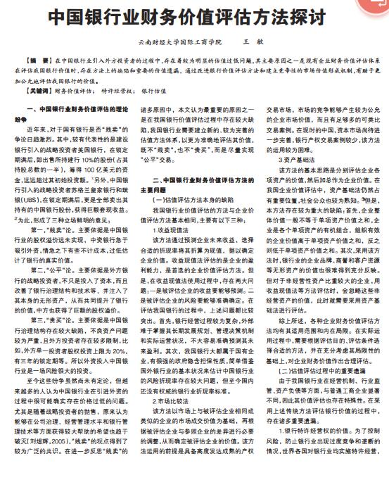 导读:在中国银行业引入外方投资者的过程中,存在着较为明显的估值过低问题,其主要原因之一是评估机构,整体资产评估公司现有企业财务报表审计,评估体系在表外资产评估,价格评估我国银行价值时,存在方法上的缺陷和重要的价值遗漏。通过改进银行价值评估方法和建立竞争性的市场价值形成机制,有助于更加公允地评估我国银行的价值。