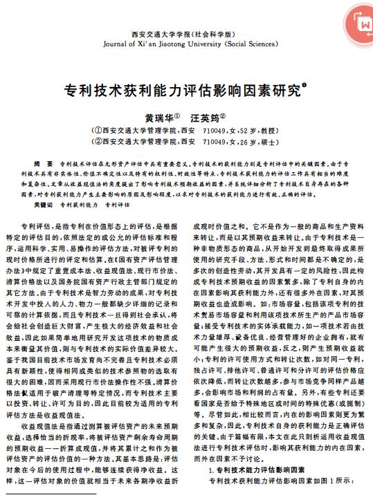导读:专利技术评估非专利技术评估评估中具有重要意义。专业评估公司专利技术的获利能力则是专利评估中的关键因素。由于专利技术具有非实体性、价值不确定性以及特有的权利性、时效性等特点,房产评估机构专利技术获利能力的评估专业资产评估工作具有相当的难度和复杂性。文章从收益现值法的角度提出了影响专利技术预期收益的因素,并系统详细分析了专利技术自身存在的各种因素,对专利获利能力产生主要影响的原因及影响程度,以求对专利技术的获利能力进行有效、正确的评估。