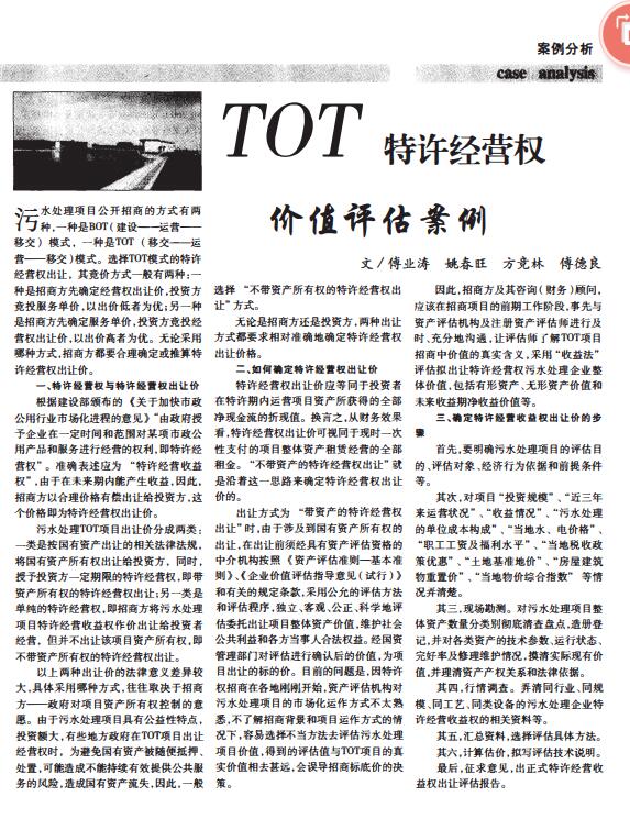 导读:经营权评估,特许经营权评估,专利技术评估应等同于投资者在特许期内运营项目资产所获得的全部净现金流的折现值。换言之,从财务效果因此,招商方及其咨询(财务)顾问,价格评估公司,专利权评估公司应该在招商项目的前期工作阶段,事先与资产评估机构及注册资产评估师进行及时、充分地沟通,让评估师了解TOT项目招商中价值的真实含义,采用“收益法”评估拟出让特许经营权污水处理企业整体价值,包括有形资产、无形资产价值和未来收益期净收益价值等。
