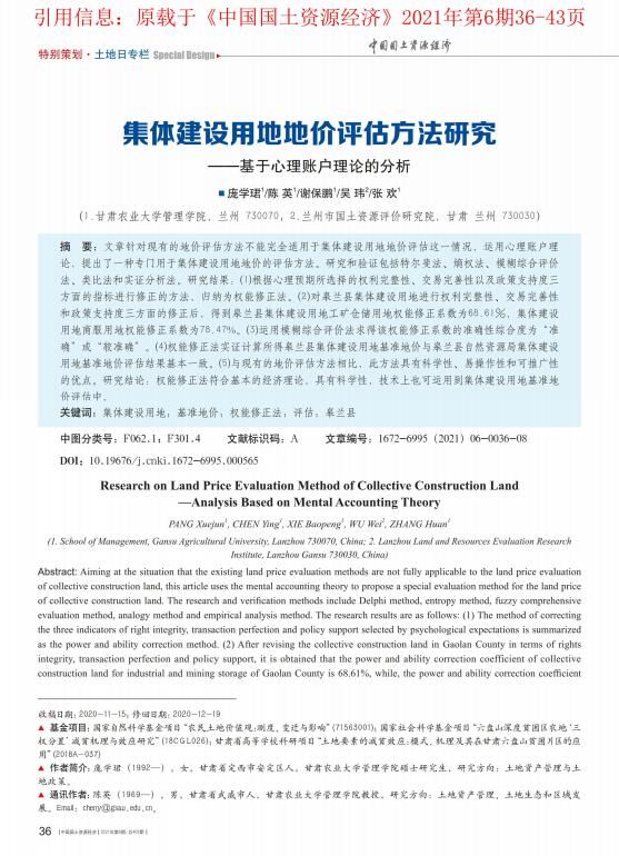 摘要:上海评估公司,整体资产评估公司,资产评估机构针对现有的土地评估,房地产评估方法不能完全适用于集体建设用地地价评估这一况,运用心理账户理论,提出了一种专门用于集体建设用地地价的评估方法。研究和验证包括特尔斐法、嫡权法、模糊综合评价法、类比法和实证分析法。研究结果:(1)根据心理预期所选择的权利完整性、交易完善性以及政策支持度三方面的指标进行修正的方法,归纳为权能修正法。(2)对皋兰县集体建设用地进行权利完整性、交易完善性和政策支持度三方面的修正后,得到皋兰县集体建设用地工矿仓储用地权能修正系数为68.61%,集体建设用地商服用地权能修正系数为78.47%。(3)运用模糊综合评价法求得该权能修正系数的准确性综合度为“准确”或“较准确”。(4)权能修正法实证计算所得皋兰县集体建设用地基准地价与皋兰县自然资源局集体建设用地基准地价评估结果基本—致。(5)与现有的地价评估方法相比,此方法具有科学性、易操作性和推广性的优点。研究结论:权能修正法符合基本的经济理论,具有科学性,技术上也可运用到集体建设用地基准地价评估中    |