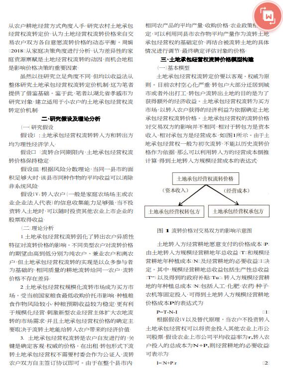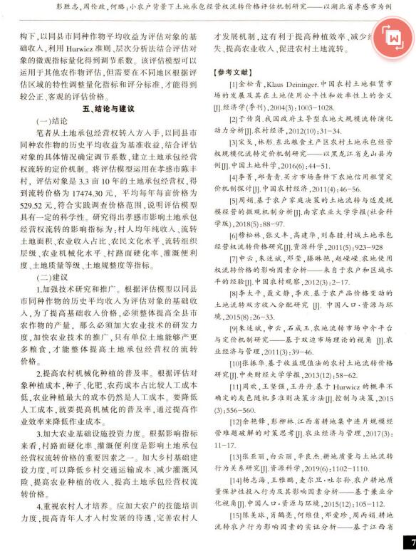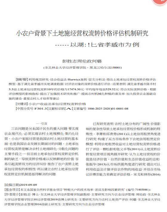 导读:房产评估公司,土地评估公司,技术评估公司利用规范研究,结合收益法、Hurwicz准则、层次分析法,得出土地承包经营权流转价值评估, 地价评估模型。基于湖北省孝感市实地调查数据,对评估对象的流转价格进行评估。结果表明:湖北省孝感市陈丰村 3.3亩土地承包经营权流转10年的价格为17474.30元,平均每年每亩529.52元,符合实际流转价格。根据 评估模型的影响指标,提出了加强技术研究和推广、提高农村机械化种植的普及率、加大投资农业基础设 施的建设、重视农村人才培养等建议。
