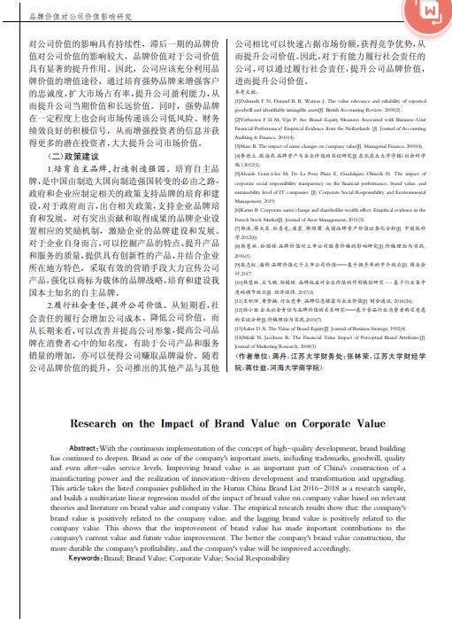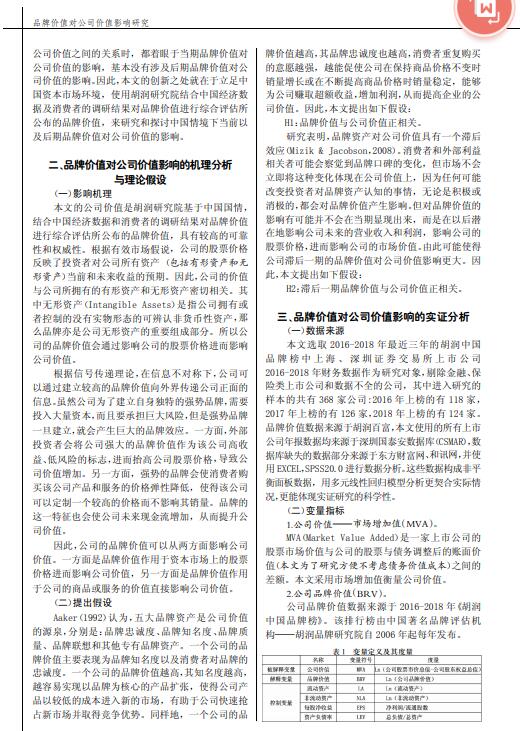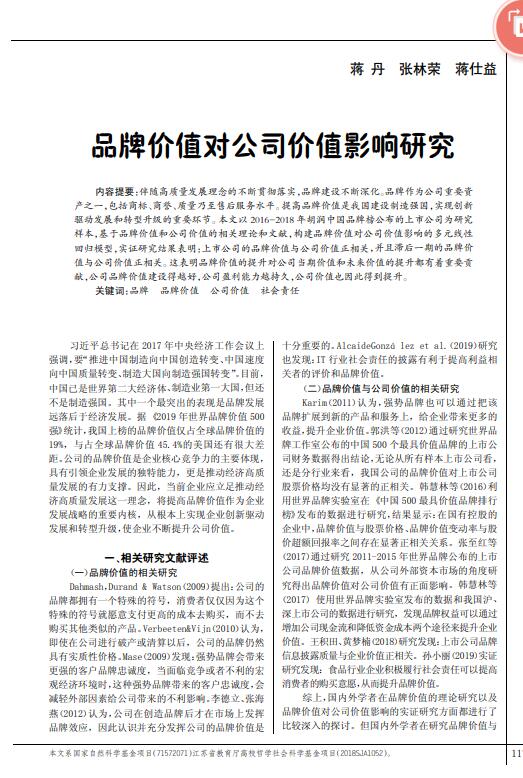 导读 :资产评估机构,资产评估公司,评估公司伴随高质量发展理念的不断贯彻落实,品牌建设不断深化。品牌作为公司重要资产之一,包括注册商标评估、商誉减值准备评估、质量乃至售后服务水平。提高品牌价值是我国建设制造强国,实现创新驱动发展和转型升级的重要环节。本文以2016-2018年胡润中国品牌榜公布的上市公司为研究样本,基于品牌价值和公司价值的相关理论和文献,构建品牌价值对公司价值影响的多元线性回归模型,实证研究结果表明:上市公司的品牌价值与公司价值正相关,并且滞后一期的品牌价值与公司价值正相关。这表明品牌价值的提升对公司当期价值和未来价值的提升都有着重要贡献,公司品牌价值建设得越好,公司盈利能力越持久,公司价值也因此得到提升。