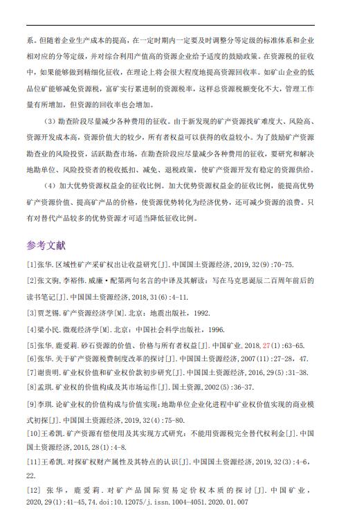 导读:探矿权评估,自然资源评估是由地质勘查劳动创造的价值和所有者权益共同组成的,矿产资源价值量等于矿产资源的绝对矿租、级差矿租和垄断矿租之和。矿产资源的价值通过价值转移与矿产资源开发劳动创造的价值共同形成矿产品价值。矿产品价值特许经营权评估量是由市场所需的开采最劣等资源的成本和绝对矿租、垄断矿租所决定的。根据风险投资的特点,地质勘查劳动创造的价值不能简单计入所勘查矿床的资源价值中,价格评估机构要由发现的大矿、富矿等价值高的经营权评估资源来补偿。通过对与矿产资源价值相关的各种关系的分析和研究,对矿产资源权益金征收制度提出建议:矿产资源权益金征收要体现公平与合理的原则;资源税的征收应实行累进制;勘查阶段尽量减少各种费用的征收;加大优势资源权益金的征收比例。    |