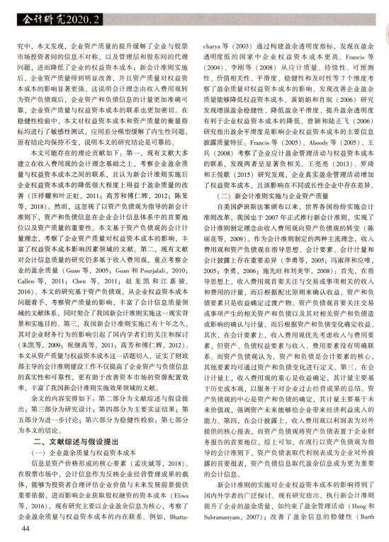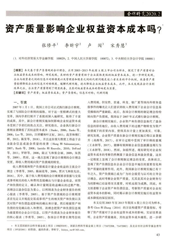 导读:资产评估机构,商标评估公司,房产评估公司基于资产负债观的会计理念,应用2003-2013年我国A股上市公司为样本,探究了资产质量对企业权益资本成本的影响。研究发现,良好的资产质量有助于企业获取更低的房屋评估,股权评估权益资本成本。进一步研究发现, 企业与投资者之间的信息不对称程度以及管理层和股东之间的代理问题是这二者关系的中介机制,改善资产质 量能够降低企业的信息不对称程度、缓解代理问题,进而降低企业权益资本成本。此外,本文发现在会计准则 改革之后,企业资产质量得到了明显改善,且其对权益资本成本的影响更为显著。