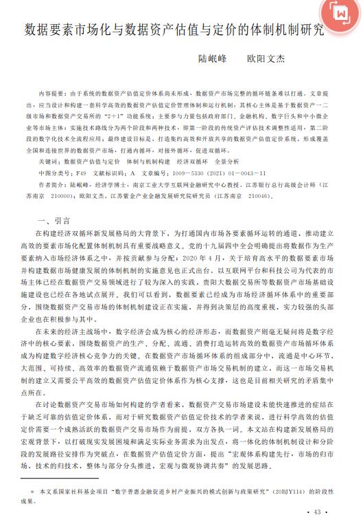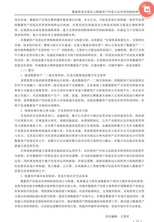 导读:由于系统的无形资产评估数据资产估值定价体系尚未形成,无形资产评估公司数据资产市场完整的循环链条难以打通。文章提出,知识产权评估应当设计和构建一套科学高效的技术评估,技术资产评估数据资产估值定价管理体制和运行机制:其核心主体是基于数据资产一二级市场和数据资产交易所的“2+1”功能系统;主要参与力量包括政府部门、金融机构、数字巨头和中小微企业等市场主体;实施技术路线分为两个阶段和两种技术,即第一阶段的传统资产评估技术调整性适用,第二阶段的数字化技术全流程应用;最终建设目标是,打造集约高效和开放共享的数据资产估值定价系统,形成覆盖全国和连接世界的数据资产市场,打通内循环,对接外循环,促进双循环。   |