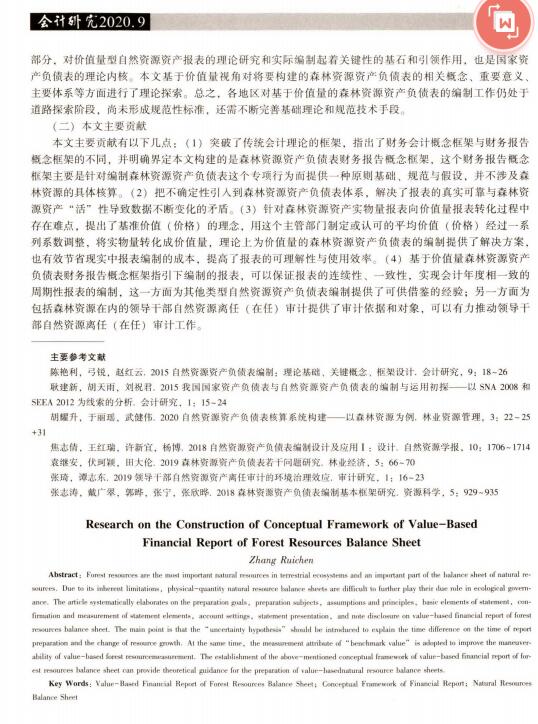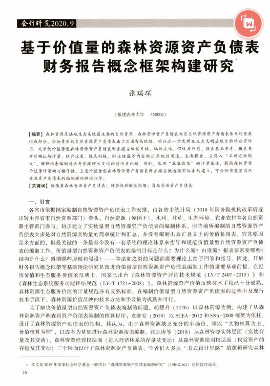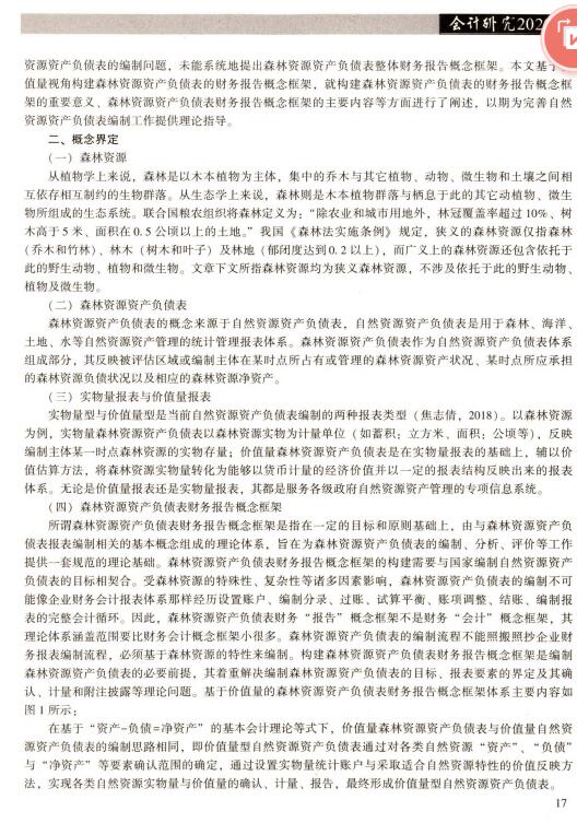导读:森林资源是陆地生态系统最主要的自然资源,森林资源资产负债表亦是森林资产评估,自然资源资产负债表体系的重要 组成部分。实物量型的树木评估自然资源资产负债表由于其固有局限性,难以进一步发挥在生态文明治理方面的应有作 用。文章就苗木评估价值量型森林资源资产负债表财务报告编制目标、编制主体、假设与原则、报表基本要素、报表要 素的确认与计量、账户设置、报表列报、经营权评估附注披露等内容做出系统性阐述。主要提出,应引入"不确定性假 设”,自然资源评估解释报表编制时点与资源增长变化的时间差问题,同时,采用“基准价值”的计量属性,提高森林资源 价值量计量的可操作性。上述价值量型森林资源资产负债表财务报告概念框架体系的建空,可为价值量型自然 资源资产负债表的编制提供理论指导。   |