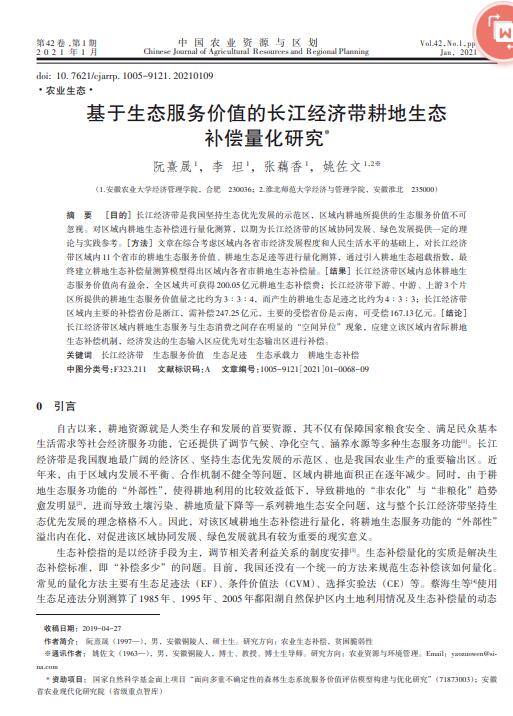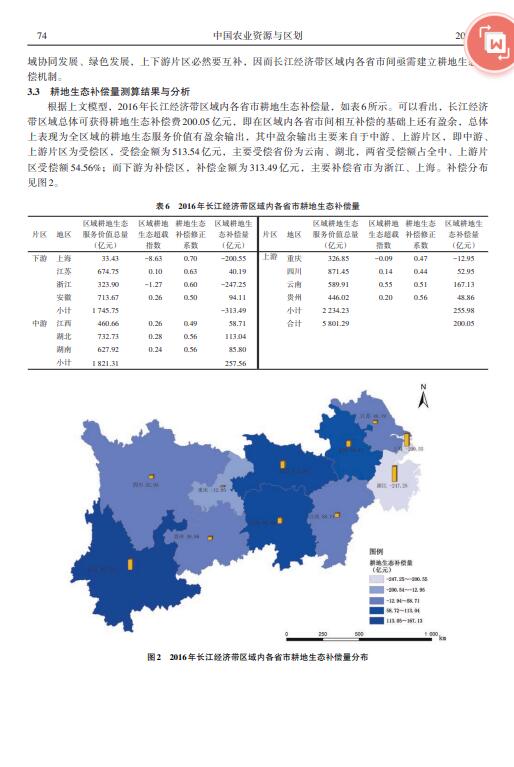 导读:长江经济带是我国坚持生态优先发展的示范区,区域内耕地所提供的生态服务价值不可忽视。土地评估对区域内耕地生态补偿进行量化测算,资产评估,以期为长江经济带的区域协同发展、绿色发展提供工程审价一定的理论与实践参考。[方法]文章在综合考虑区域内各省市经济发展程度和人民生活水平的基础上,自然资源评估对长江经济带区域内11个省市的耕地生态服务价值、耕地生态足迹等进行量化测算,林木评估通过引入耕地生态超载指数,最终建立耕地生态补偿量测算模型得出区域内各省市耕地生态补偿量。[结果]长江经济带区域内总体耕地生态服务价值尚有盈余,全区域共可获得200.05亿元耕地生态补偿费;长江经济带下游、中游、上游3个片区所提供的耕地生态服务价值量之比约为3∶3∶4,而产生的耕地生态足迹之比约为4∶3∶3;长江经济带区域内主要的补偿省份是浙江,需补偿247.25亿元,主要的受偿省份是云南,可受偿167.13亿元。[结论]长江经济带区域内耕地生态服务与生态消费之间存在明显的“空间异位”现象,应建立该区域内省际耕地生态补偿机制,经济发达的生态输入区应优先对生态输出区进行赔偿评估。   |