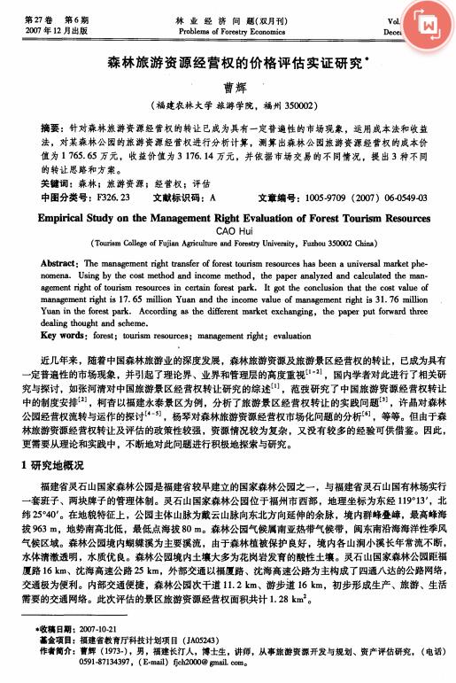 导读:针对森林旅游资源经营权的转让己成为具有一定普遍性的市场现象,自然资源评估,林木评估运用成本法和收益 法,树木评估对某森林公园的旅游资源经营权进行分析计算,测算出森林公园旅游资源经营权的成本价 值为1 765.65万元,收益价值为3 176.14万元,并依据市场交易的不同情况,树林评估提出3种不同 的转让思路和方案。 上海资产评估这种方法主要思想是森林公园方面以现有的森林资源资产人股,而新的投资方以资金人股,采用联 合经营、股份经营等方式组建经营共同体,共同投资、经营、管理森林公园。显然,价格评估机构这种方案的优势体 现在于保持现有森林公园(林场)经营管理体制和职工相对稳定的同时,引入新的旅游投资,能有效 解决当前森林公园资金不足的难题,若能与新的投资方合作融洽、经营效益好,那么就可以获得森林公 园最大的利益。其劣势在于与新的投资方配合管理成功的风险较大,一旦合作机制不顺,那么整个项目 设想的基本目的与设想解决的基本问题都将不能实现。    |