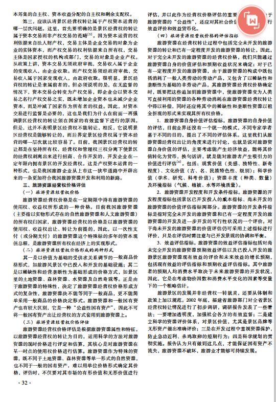 导读:评估公司,评估机构在关于“景区经营权转让”问题上,业界一直存在着较大的分歧。本文固定资产评估在阐述旅游经营权基本概念的基础上,结合旅游资源的特点,整体资产评估从旅游资源经营权价格、价格评估体系的形成及表现形式,以及评估指标的构成方面进行探讨,认为旅游资源经营权在一定条件下是完全可以转让的。近儿年来,以南方的一些省市为先导,我国掀起了旅游景区经营权转让的大潮。企业资产评估在关于“景区经营权转让”问题上一直存在着较大的分歧,早在1997年我国第一宗景区经营权转让案例的出现开始,评估资产关于“转让”还是“不能转让”的争论就一直没有停止过。其实,旅游产业本身所具有的开放性决定了旅游产业必须实行全方位开放的政策措施。在加入WTO之后,中国旅游产业的对外开放程度将逐步提高,旅游景区也将以委托经营、租赁经营、特许经营等多种形式来进行管理和运营。  |