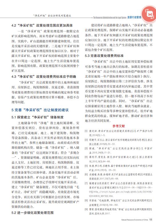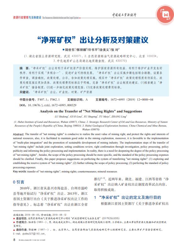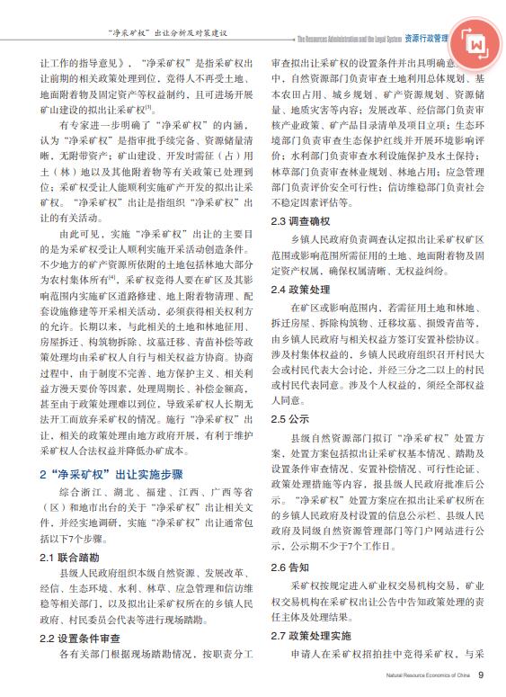 导读:“净采矿权”出让有利于采矿权评估采矿权资产价值实现,维护国家资源所有权益,探矿权评估有利于维护矿业开发良好秩序,经营权评估,有利于实现“多规合一”,自然资源评估促进矿业可持续发展。“净采矿权”出让实施步骤包括联合踏勘、设置条件审查、调查确权、政策处理、公示、告知政策处理实施。财产价格评估现实中“净采矿权”政策处理程度有待深化,政策处理范围应更加具体,政策处理费用标准应予明确。完善“净采矿权”出让制度的建议:(1)探索建立“净采矿权”储备制度;(2)进一步细化政策处理范围;(3)完善政策处理费用标准。   |