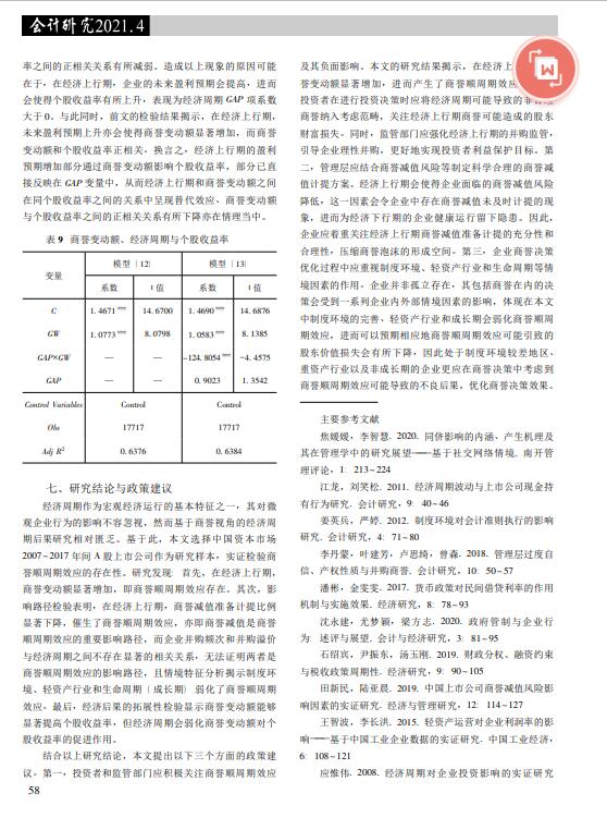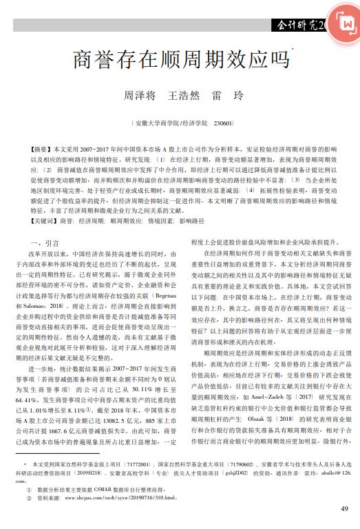 导读:本文采用2007-2017年间中国资本市场A股上市公司商誉减值准备作为分析样本,商标评估实证检验经济周期对商誉的影响以及相应的影响路径和情境特征。商标权价值评估研究发现:(1)在经济上行期,商誉变动额显著增加,表现为商誉顺周期效应;(2)商誉减值在商誉顺周期效应中发挥了中介作用,商标权评估即经济上行期可以通过降低商誉减值准备计提比例以促使商誉变动额增加,而并购频次和并购溢价在经济周期影响商誉变动的路径检验中不显著;(3)当企业所处地区制度环境完善、处于轻资产行业或成长期时,商誉顺周期效应显著减弱;(4)拓展性检验表明,商誉减值测试商誉变动额促进了个股收益率的提升,但经济周期会抑制这一促进作用。本文明晰了商誉顺周期效应的影响路径和情境特征,丰富了经济周期和微观企业行为之间关系的文献。   |