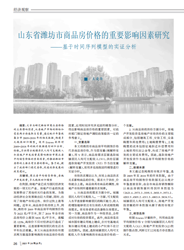 导读:文章房屋评估为研究潍坊市商品房价格的主要影响因素,房屋估价公司从房地产市场的供给和需求两方面选取自变量,通过统计年鉴收集全市 2009~2018 年的相关数据,构建多元 线 性 回 归 模 型 。 使 用 Eviews 软 件 对2009~2018 年的统计数据进行回归分析、检验。房地产评估公司实证得出城镇居民人均可支配收入和房地产开发投资是影响潍坊市商品房平均销售价格的重要因素,房地产评估机构对推动潍坊市房价的上涨具有显著的影响。 鉴于此,提出了政府部门稳定房价,促进经济发展的政策建议。在我国,房地产业已成为国民经济发展的一项支柱产业, 房地产行业的快速发展带动了其他相关行业的发展, 房屋估价为推动经济社会发展做出巨大贡献,同时,出现了房地产市场过热、 房价过快上涨等问题。 近年来,商品房价格持续上升,例如,潍坊市 2009 年商品房平均销售价格为 2622 元/平方米,到了 2018 年全市商品房均价上涨到 5835 元/平方米, 涨幅达 123%,高房价不仅对经济运行造成了重要影响, 还直接影响到居民的生活水平和生活质量。 本文从商品房供给和需求两方面选取影响潍坊市商品房价格的因素,应用时间序列多元回归模型分析,得出影响商品房价格的重要因素, 对政府部门制定房地产调控政策提供一定的参考意义。   .png) |