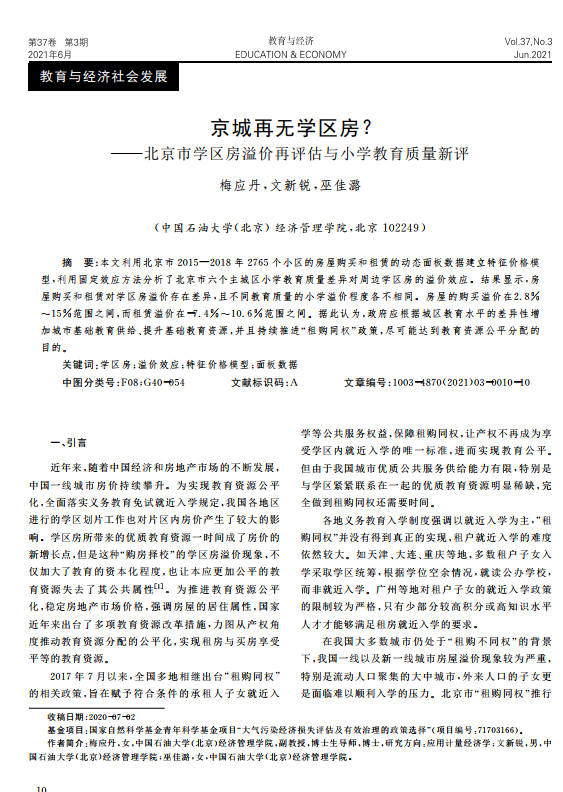 导读 :房地产评估公司利用北京市2015—2018年2765个小区的房屋购买和租赁的房地产评估动态面板数据建立特征价格模型,利用固定效应方法分析了北京市六个主城区小学教育质量差异对周边学区房的溢价效应。土地评估公司结果显示,房屋购买和租赁对房产评估学区房溢价存在差异,房地产估价且不同教育质量的小学溢价程度各不相同。房屋的购买溢价在2.8%~15%范围之间,房子估价而租赁溢价在-7.4%~10.6%范围之间。据此认为,政府应根据房屋价值评估城区教育水平的差异性增加城市基础教育供给、提升基础教育资源,并且持续推进“租购同权”政策,尽可能达到教育资源公平分配的目的。    |