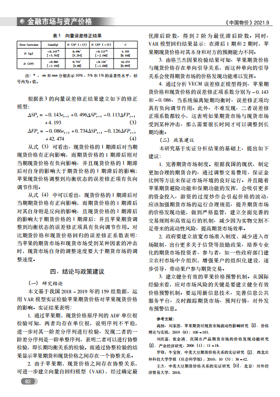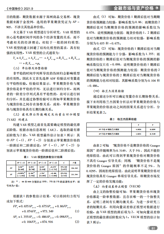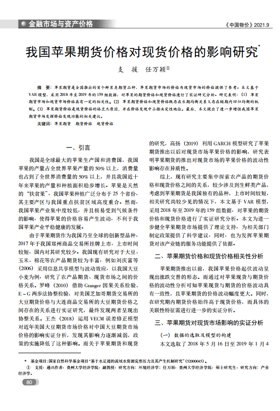 导读: 苹果期货是全国推出的首个鲜果类期货品种, 苹果期货市场的资产价格评估为现货市场的价格提供了参考。本文基于VAR 模型, 采用 2018 年至 2019 年的 159 组数据, 企业品牌资产评估对苹果的期货价格和现货价格进了实证研究分析。研究表明: ( 1) 苹果期货市场和现货市场价格具有一定的相关性。( 2) 苹果期货价格和货价格既存在上海资产评估长期均衡关系又存在短期内回归均衡的机制。( 3) 整体资产价值评估苹果期货价格是现货价格的格兰杰原因,林木资产评估并在价格发现中占据决定性地位。最后, 本文提出了进一步增强我国苹果期货市场发挥价格发现功能的相关建议。    |