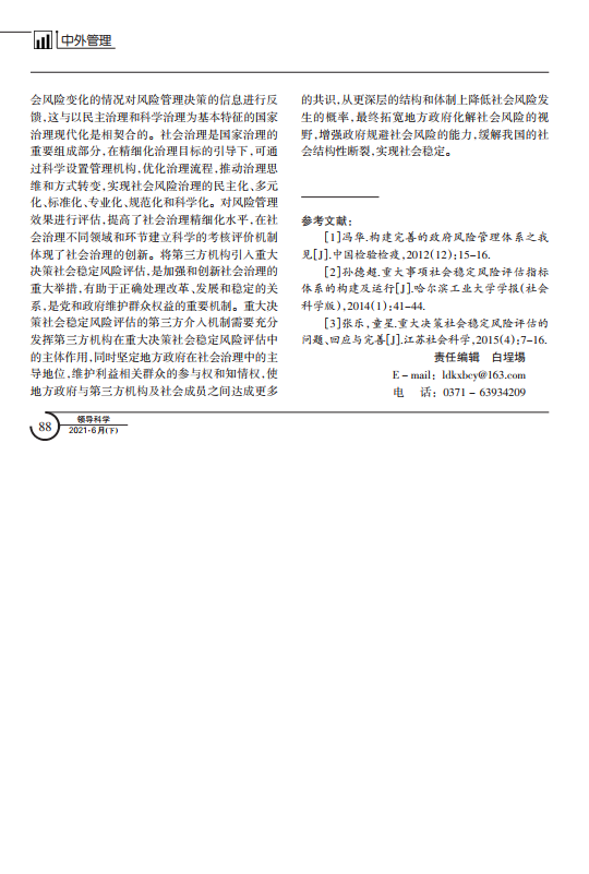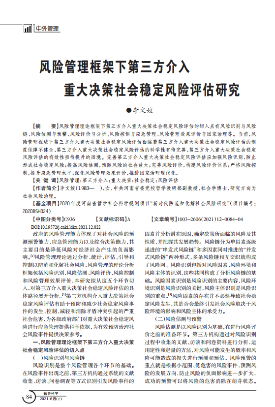 导读: 风险管理理论框架下第三方介入重大决策社会稳定企业资产价值评估风险评估的切入点有风险识别与风险链、风险估测与预警、风险评价与分析、风险控制与应急管理、风险管理效果评价赔偿评估与评估资产国家治理等。当前,风险管理视域下第三方介入重大决策社会稳定风险评估面临着第三方介入重大决策社会稳定风险评估的制度保障不健全、第三方介入重大决策社会稳定风险评估的机器设备评估科学性有待完善、第三方介入重大决策社会稳定风险评估的有效性亟待提升的困境。完善第三方介入重大决策社会稳定风险评估应加强风险识别,防止形成社会稳定风险;整体资产价值评估提高风险估测,预防风险的社会放大;完善风险评价,构建风险评价体系;严格风险控制,提升应急管理水平;深化风险管理效果评价,推进国家治理现代化。   |