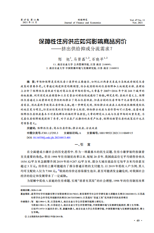 导读: 市场和保障是实现住房小康梦的主要途径,企业资产价值评估,资产价格评估如何认识两者关系成为各级政府制定住房政策的重要参考。地价评估,房屋评估通过构建供需均衡模型,结合我国特殊的住房保障和土地制度安排,在理论上分析了保障性住房供应可能对商品住房场的影响。房子拆迁评估,房产评估基于 2007-2016 年中国 248 个城市的面板数据,利用固定效应模型和工具变量法对理论假说进行了检验。研究表明:在统计意义上,保障性住房通过土地资源的竞争性配给挤出了商品住房供应,但在分割的住房市场中无法替代商品住房需求,因此最终导致商品房价格上涨。进一步研究发现,供给挤出效应在土地财政依赖程度较低的地区更为明显。但实证结果的实际经济含义较弱,供给挤出效应与房价影响可以忽略,这意味着保障性住房供应基本不对其他群体的福利带来损害。文章的研究从土地与住房市场的双重角度,为完善住房保障制度提供了参考,对于正在广泛推行的共有产权房、保障性租赁住房的政策设计也具有借鉴意义。