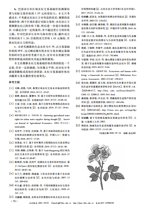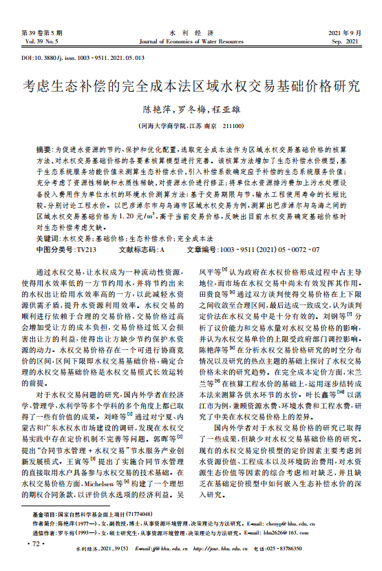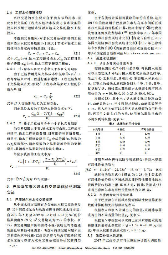 导读: 为促进水资源的节约、保护和优化配置, 房屋租金评估选取完全成本法作为区域水权交易基础价格的核算方法, 对水权交易基础价格的各要素核算模型进行完善。该核算方法增加了生态补偿水价模型, 财产评估基于生态系统服务功能价值来测算生态补偿水价, 厂房估价引入补偿系数确定应予补偿的生态系统服务价值;充分考虑了资源性稀缺和水质性稀缺,房屋估价 对资源水价进行修正; 将单位水资源排污费加上污水处理设备投入费用作为单位水权的环境水价测算方法; 基于交易期限与节、输水工程使用寿命的长短比较, 厂房估价分别讨论工程水价。以巴彦淖尔市与乌海市区域水权交易为例,资产价值评估 测算出巴彦淖尔与乌海之间的区域水权交易基础价格为 1. 20 元 /m3, 高于当前交易价格, 反映出目前水权交易确定基础价格时对生态补偿考虑欠缺。