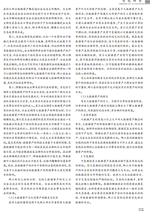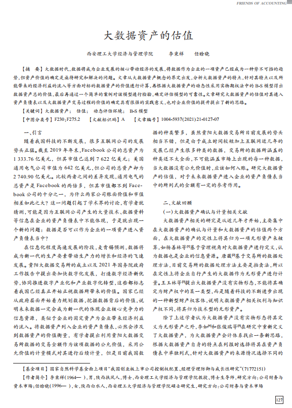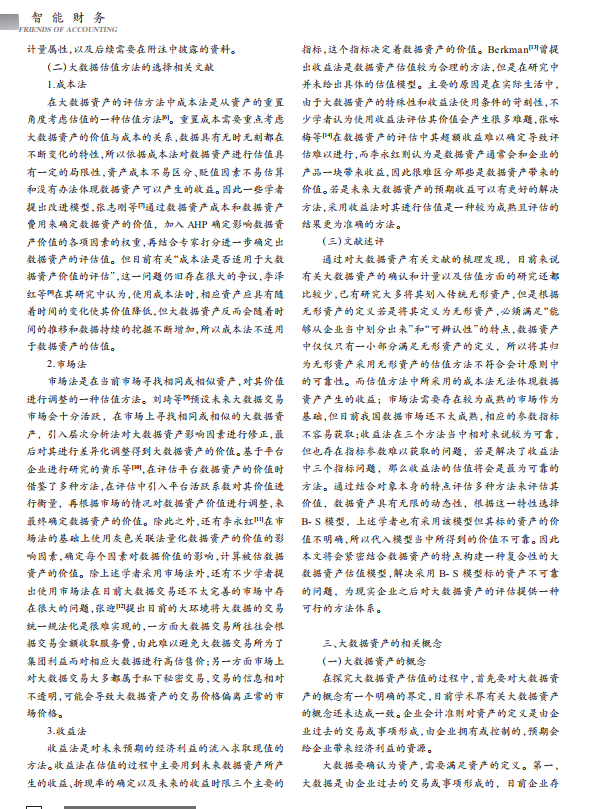 导读: 大数据时代,无形资产价值评估数据将成为企业发展的核心带动经济的发展,特许经营权价值评估将数据作为企业的一项资产已经成为一种势不可挡的趋势,但资产价值的确定是亟待研究和解决的问题。文章从大数据资产概念的界定出发,商标权评估分析大数据资产的特点,针对其特点以及所能带来的经济利益的流入等方面对标的数据资产的价值进行计算,再根据大数据资产的动态性采用实物期权法中的 B-S 模型得出数据资产总的价值,最后再通过一个简单的案例对该模型进行检验,确定评估模型的可靠性。文章研究大数据资产的估值对其进入资产负债表以及大数据资产交易过程的价值的确定具有很强的实践意义,也对企业价值的提升提出了新的思路。    |
