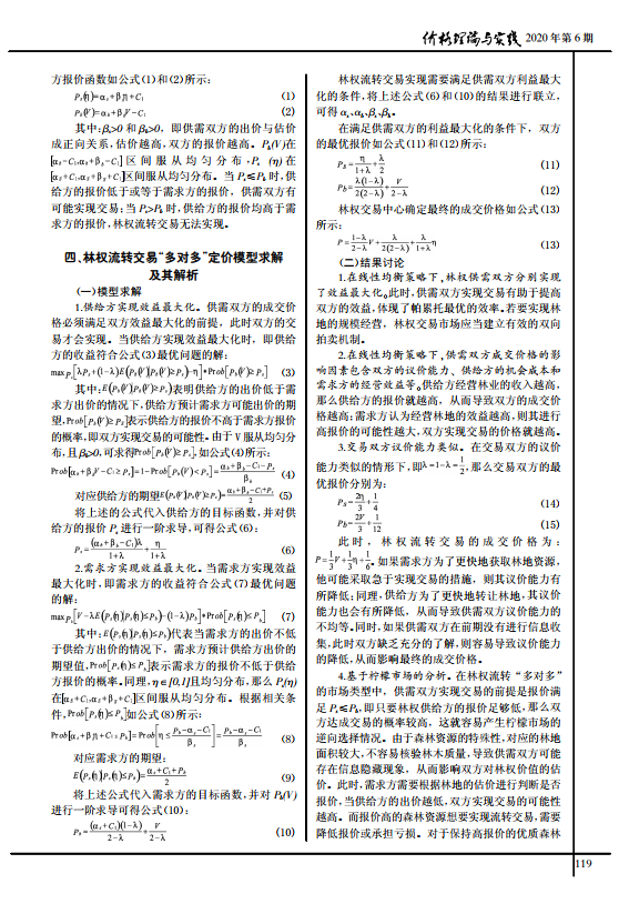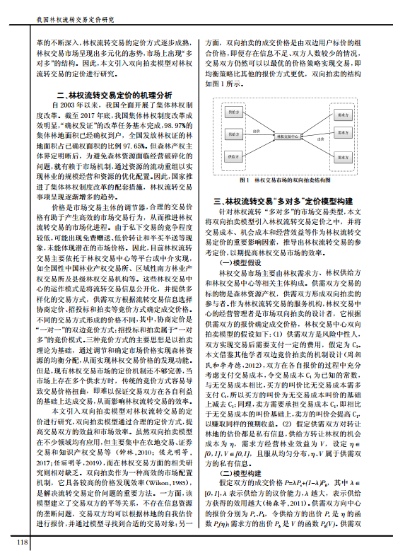 导读: 我国林业改革的重要任务之一是促进集体林权的合理流转, 采矿权评估实现林业的适度规模经营。 而船舶评估价格是调节林权流转交易的重要手段, 林木资产评估有助于推进林权流转交易的市场化进程。 现有林权交易市场形成了“多对多”的新型市场结构。 本文引入双向拍卖模型对这一市场类型进行初步探讨, 探寻合理的林权流转交易定价模式, 研究表明: 房屋价格评估供需双方实现交易有助于提高双方的效益和市场效率, 双方成交财产评估价格的影响因素包含双方的议价能力、土地评估供给方的机会成本及需求方的经营效益等。 基于此, 本文提出了根据交易双方的实际需求, 尽可能实现双方利益最大化; 积极培育林权交易中心等交易平台, 完善林权流转交易定价机制; 建立完善的市场监管制度, 促进林权交易市场的规范发展等建议。   |