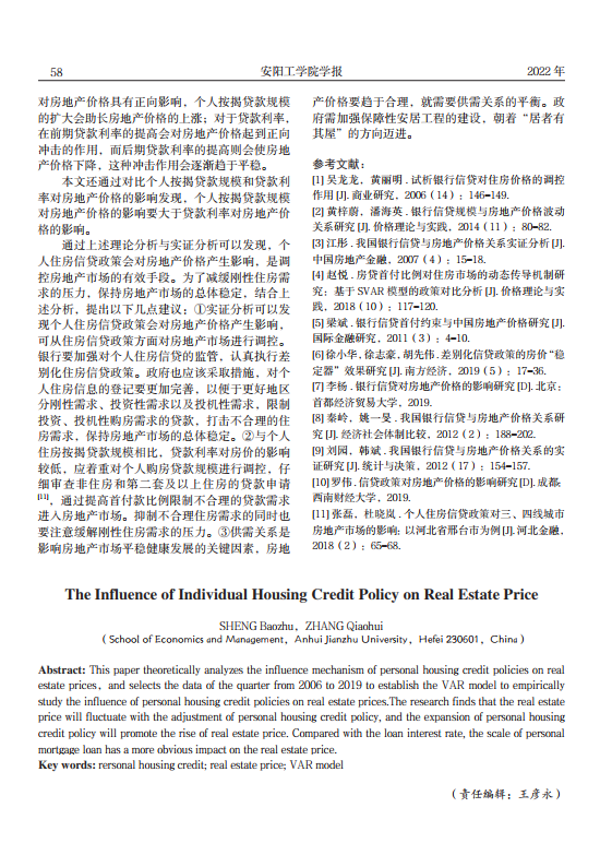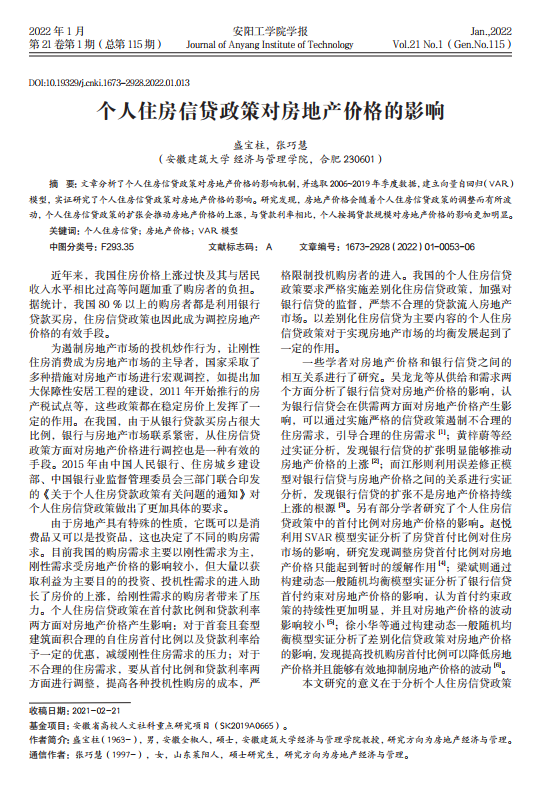 导读 : 文章分析了个人住房信贷政策对房地产价格的影响机制,设备价格评估并选取 2006~2019 年季度数据,整体资产评估建立向量自回归(VAR)模型,机器评估实证研究了个人住房信贷政策对房地产价格的影响。研究发现,减值准备评估房地产价格会随着个人住房信贷政策的调整而有所波动,个人住房信贷政策的扩张会推动房地产价格的上涨,价格评估与贷款利率相比,企业整体资产评估个人按揭贷款规模对房地产价格的影响更加明显。