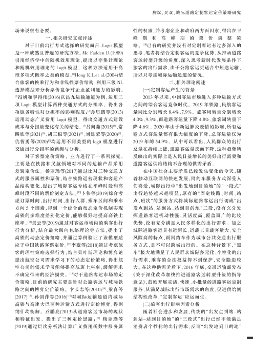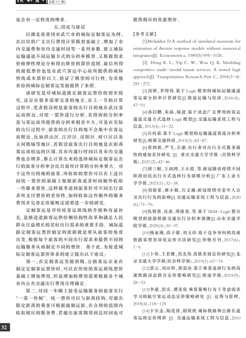 导读:随着中国经济的快速发展,城市与城市之间的评估机构联系愈发紧密,人们的出行需求也越来越多,客运市场逐渐繁荣。 在城际运输通道中,城际高铁的修建与运营对道路客运造成了不小的冲击,地价评估为推进中国道路客运转型发展,城际道路定制客运服务应运而生。 股权评估,为体现定制客运“门到门”运输的特点,从旅客出行的全过程进行分析,无形资产评估采用 logit 模型描述旅客的出行分担率,并在广义出行费用函数中加入了市内交通费和市内交通时间整体资产评估公司等因素,更加符合实际地分析旅客在资产评估公司出行全过程中的所有消耗,然后通过对湖北省黄冈市武穴市的城际定制客运服务进行实例分析, 运用需求价格弹性理论得出能够提高定制客运分担率的票价范围,结果验证了方法的可行性,为城际道路定制客运定价提供新的思路。 最后,提出了研究的不足之处及对未来研究的展望,并对中国城际道路定制客运发展提出了定价建议。   |