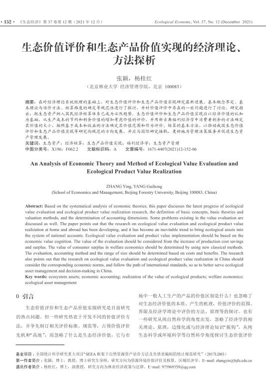导读:在对经济理论系统梳理的基础上,对生态价值评价和生态产品价值实现研究最新进展、基本概念界定、基本理论与评估公司,上海评估公司,评估机构估价方法、核算维度的确定等规范性进行了探讨,并对价值评价中存在的一些问题进行了讨论。研究指出:把生态资产纳入国民经济核算体系已成为必然趋势。生态价值评价和生态产品价值实现应以经济价值的认知为基础,土地评估,设备评估,固定资产评估,价格评估从生产成本的节约和剩余价值的增加考虑价值的评价,并用新古典福利经济学 中消费者剩余的方法确定其价值的大小,按照基于成本和收益的方法确定其价值范围和作为评价、核算的基本方法,以推动我国生态价值评价和生态产品价值实现等研究向规范的方向发展,并应与国际研究接轨,更好地为管理决策服务并促进生态资产管理发展。 |