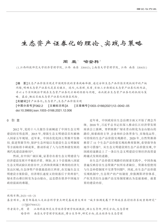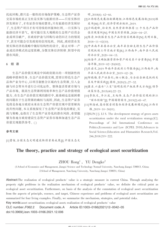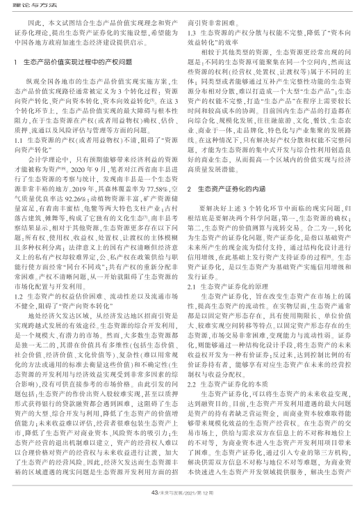 导读:生态产品价值实现是中国现阶段的重要战略举措。资产评估,资产评估公司,无形资产评估通过分析生态产品价值实现机制中的产权问题,明确生态资产证券化是其关键点。 进而,从原理、本质、目标三方面阐述生态资产证券化的内涵,并以 4 个实例概括中国在生态资产证券化方面的经验与问题, 由此提出生态资产证券化的机制与策略。 最后,概述实施生态资产证券化的潜在风险。生态产品价值实现是中国政府提出的一项创新性的战略举措和任务。生态产品价值实现,需要以特色生态产品和产业为中心,以项目制整合区域内生态资源,引入金融与社会资本并进行公司化运作, 专利评估,评估公司,房地产评估,房地产评估公司整体盘活要素市场与产品市场, 提高生态资源利用效率和生态产品价值增值能力。在生态产品价值实现的路径中,最基础也是最困难的问题在于生态资源的确权与流转,因此,生态资产证券化将是各地方政府未来在生态资产价值实现中需要解决的共性问题。本文系统探究了生态资产证券化的理论、实践与策略,也指出了生态资产证券化的潜在风险,希望能够为各地方政府建设生态资产证券市场和加速生态产品价值实现提供参考。    |