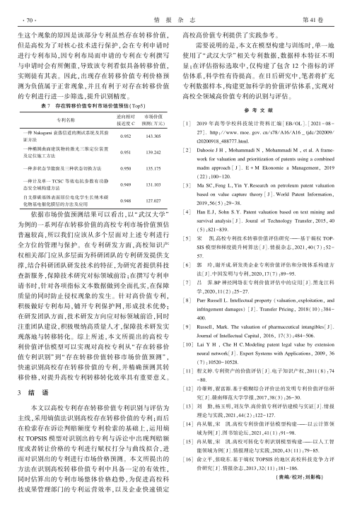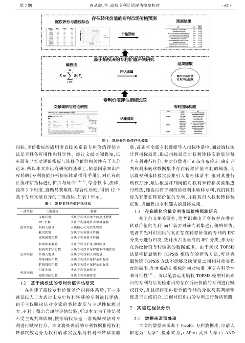 导读:[研究目的]构建高校专利价值评估模型 , 快速识别高校存在转移价值的专利 , 并精确预测其转移价格 , 对提升高校专利转移转化效率具有重要意义 。 [研究方法]结合已有研究形成的专利评估指标 ,资产评估,资产评估公司,无形资产评估 构建包含多指标的专利价值评估体系 ; 进而以 “ 武汉大学 ” 为例 , 创建专利价值评估数据集 ; 而后采用熵值法识别 “ 武汉大学 ” 专利数据集中具备转移价值的专利 ; 最后在 IncoPat 数据库中检索具备转移价值专利中的主要 IPC 分类号下存在诉讼价值的专利 , 运用熵权 TOPSIS 模型对识别出的专利与后期检索出的存在诉讼价值的专利进行赋权打分 , 专利评估,评估公司,房地产评估,房地产评估公司将存在诉讼价值专利分数与其判赔额度进行曲线拟合 , 结合拟合曲线对识别出的专利进行价格预测 。 [研究结论]通过实证分析 , 构建的高校专利价值评估模型在识别与评估高校具备转移价值专利中具备一定的有效性 , 并且预测出的专利价格整体上符合市场整体价格趋势 , 为促进高校科技成果管理部门的专利运营效率 , 以及企业快速锁定高校高价值专利提供了实践参考 。  |
