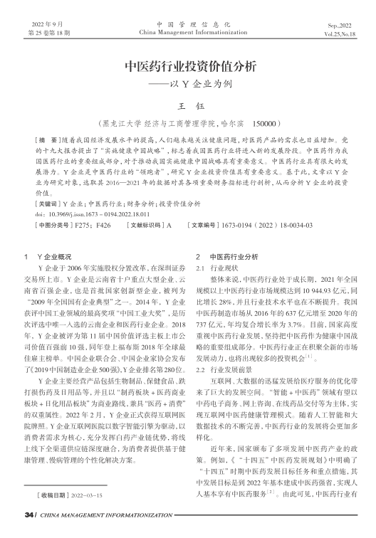 导读:随着我国经济发展水平的提高,人们越来越关注健康问题,资产评估,资产评估公司,无形资产评估对医药产品的需求也日益增加。党的十九大报告提出了“实施健康中国战略”,标志着我国医药行业将进入新的发展阶段。中医药作为我国医药行业的重要组成部分,对于推动我国实施健康中国战略具有重要意义。中医药行业具有很大的发展潜力。Y 企业是中医药行业的“领跑者”,研究 Y 企业专利评估,评估公司,房地产评估,房地产评估公司投资价值具有重要意义。基于此,文章以 Y 企业为研究对象,选取其 2016—2021 年的数据对其各项重要财务指标进行剖析,从而分析 Y 企业的投资 价值。 |